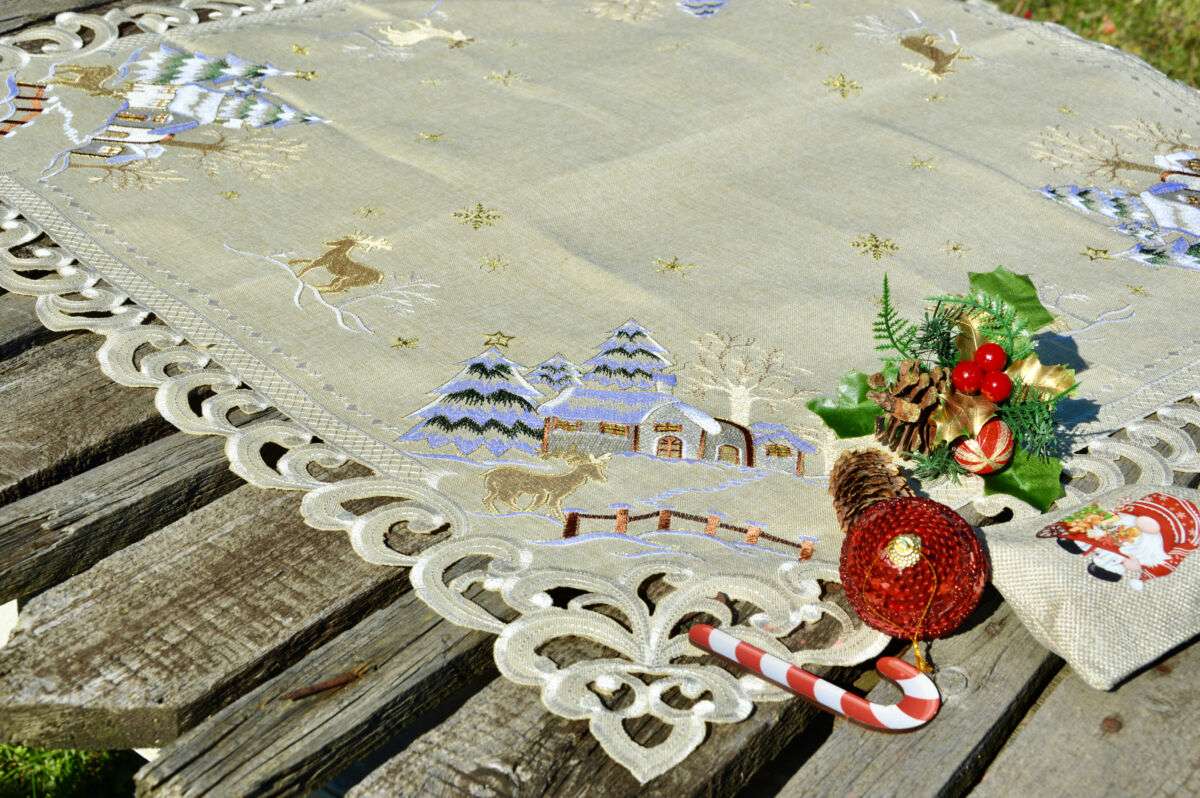 Karácsonyi asztalközép terítő elegáns ekrü színben, gépi hímzéssel. Mérete 85×85 cm, anyaga poliészter. A szegély hímzése miatt mossad kézzel, forró vasalóval vasalhatod!