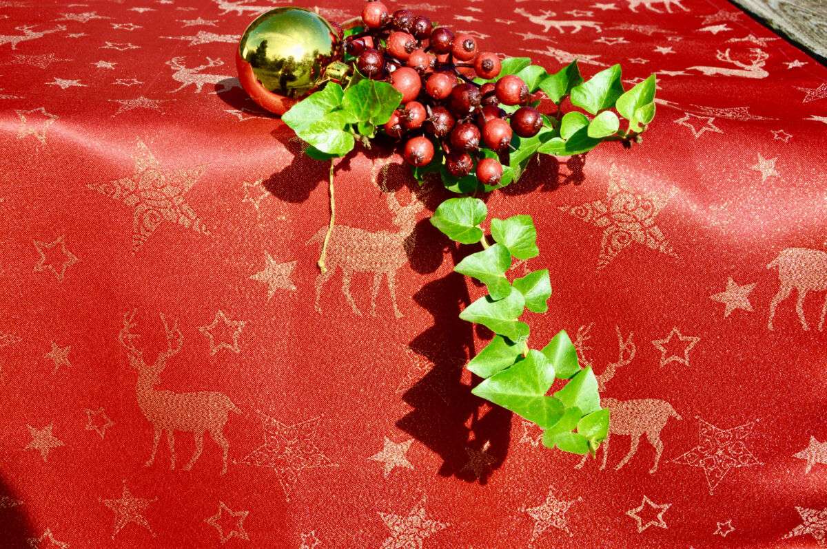 Ünnepi terítő, mely egy gyönyörű abrosz. Ünnepi terítő piros poliészter anyagból, szövött, arany lurex szarvas mintával.
