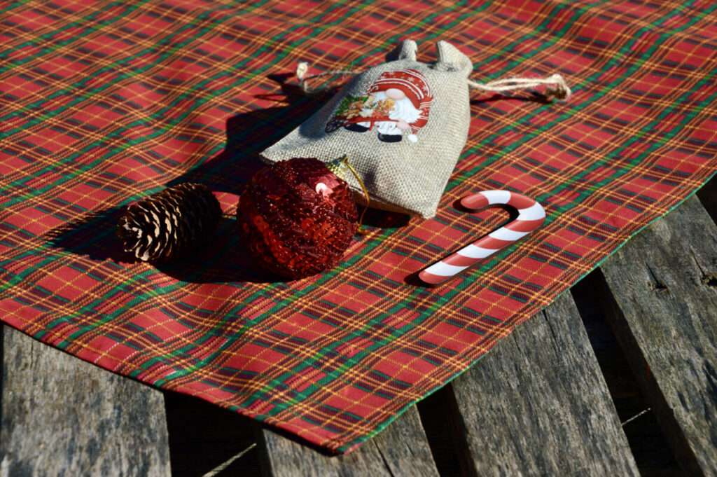 Karácsonyi asztalközép – skótkockás 70×70 cm