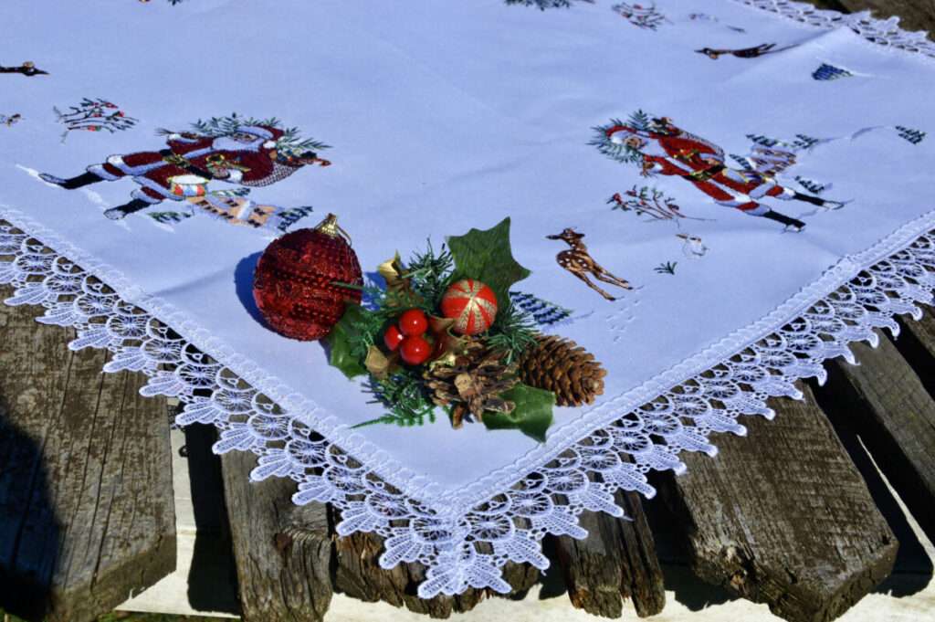 Télapós asztalközép – fehér csipkés terítő 85×85 cm