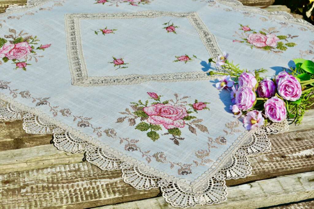 Hímzett kis terítő – Emily rózsái 30×30 cm
