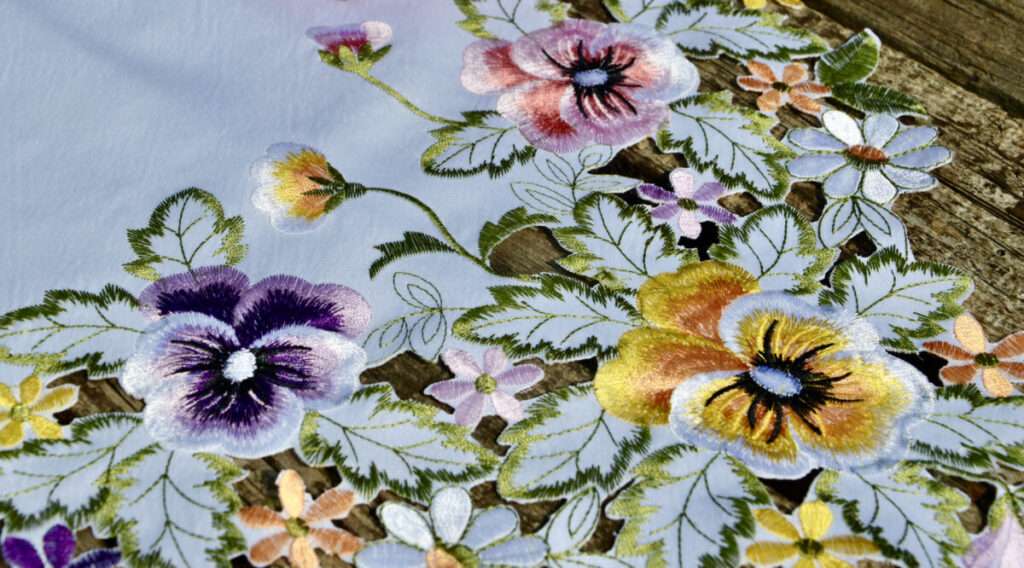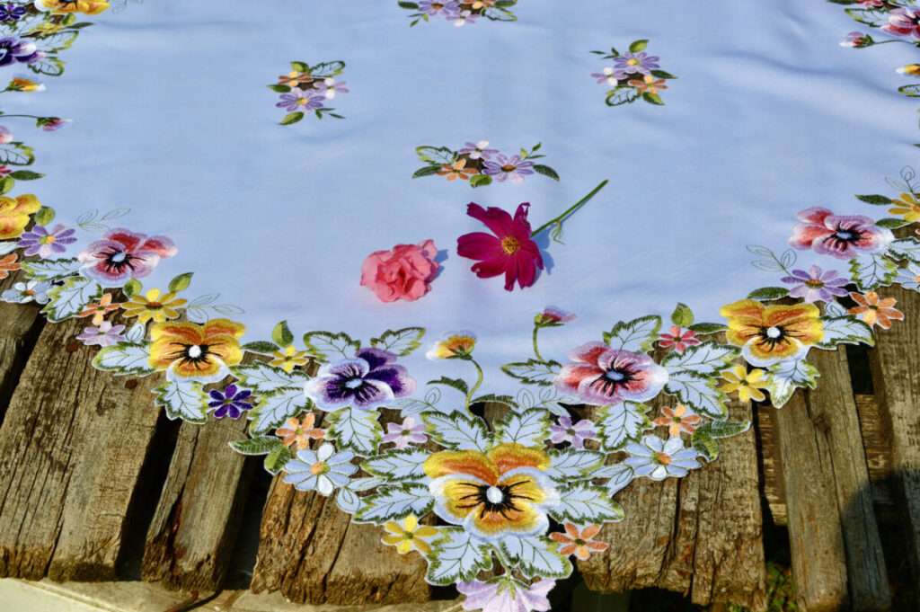 Most a mintáját mutatom ennek a terítőnek. Sűrűn hímzett árvácskák és apró kerti virágok díszítik a terítőt. Jó a színe és olyan, mintha élnének rajta az árvácskák. Illenek minden lakásba és öröm az asztalra nézni, ha rajta van az árvácskás terítő.